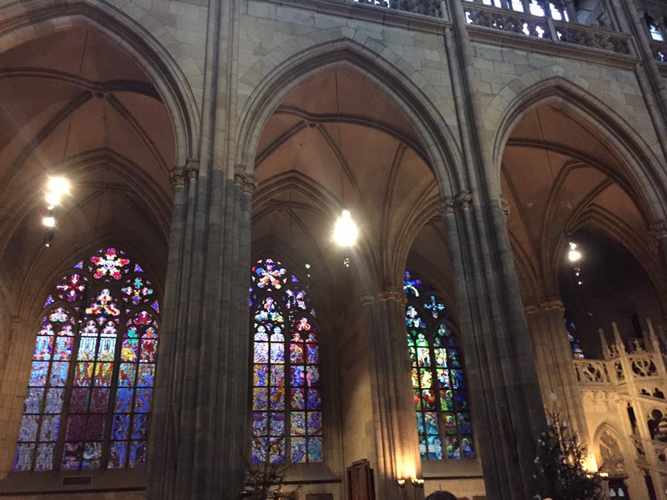 聖ヴィート聖堂内には、チェコの画家、アルフォンス・ミュシャによるステンドグラスが、様々な色彩を放っています。( 写真1)
