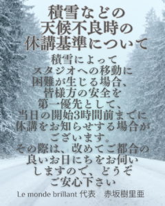 状況を見極め、レッスン開始3時間前までに最終判断を個別にご連絡いたします。